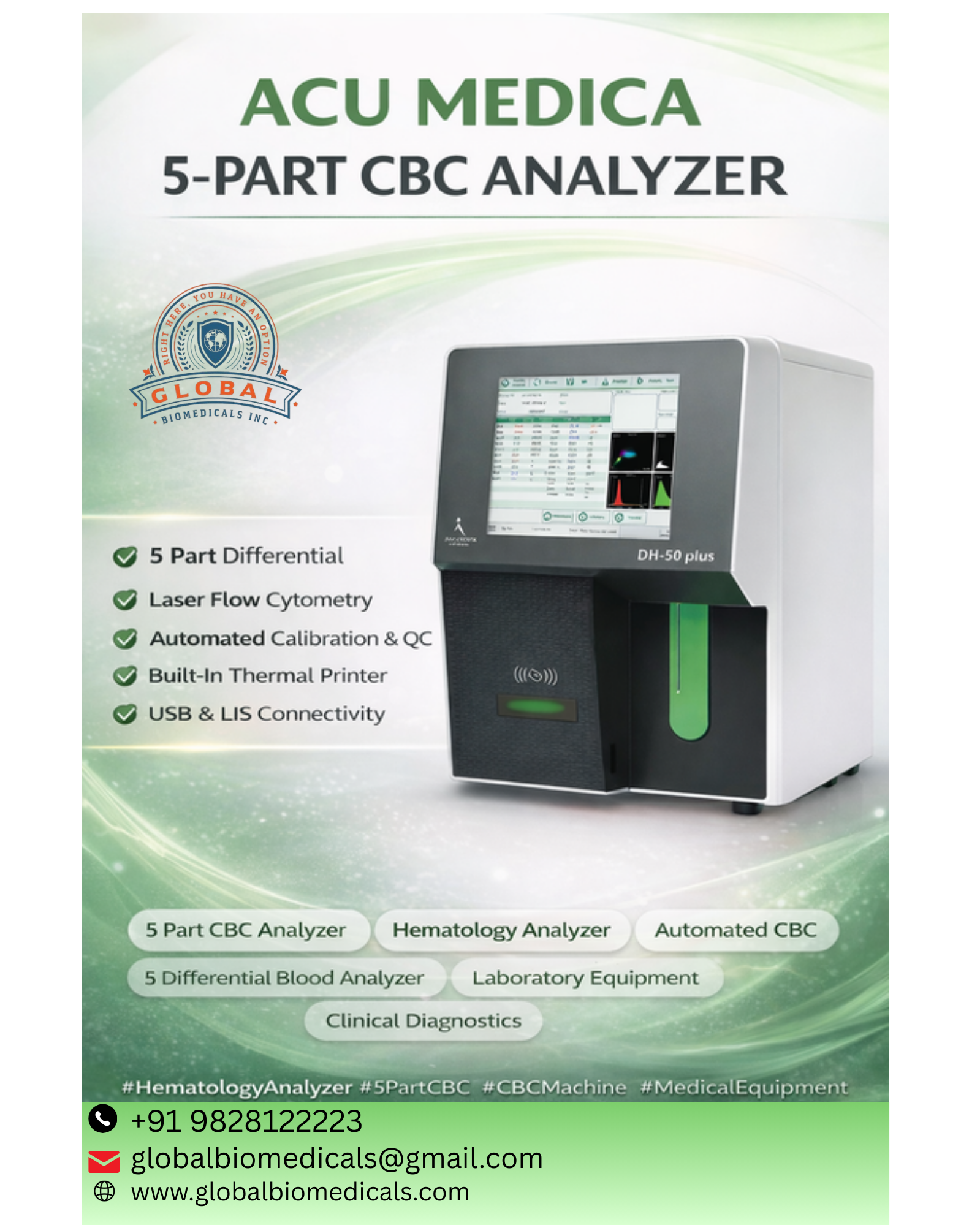 The Acu Medica 5-Part CBC Analyzer is a fully automated hematology analyzer designed for accurate and high-speed complete blood count testing in diagnostic laboratories and hospitals, utilizing advanced laser flow cytometry technology to deliver precise 5-part WBC differentiation along with comprehensive parameters including WBC, RBC, HGB, HCT, MCV, MCH, MCHC, RDW, PLT, MPV and more; with a throughput of up to 60 tests per hour, low sample volume requirement, automatic sample aspiration, intelligent clog prevention system, built-in quality control program, large data storage capacity, LIS connectivity, and user-friendly touch screen interface, it ensures reliable performance, efficient workflow, and minimal maintenance, making it an ideal cost-effective solution for small to medium diagnostic centers seeking high-precision hematology testing; #AcuMedica #5PartCBC #HematologyAnalyzer #FullyAutomaticCBC #WBCDifferential #DiagnosticEquipment #LabEquipment #PathologyLab #HospitalEquipment #BloodCellCounter #IVDProducts #LaboratoryAutomation #ClinicalDiagnostics