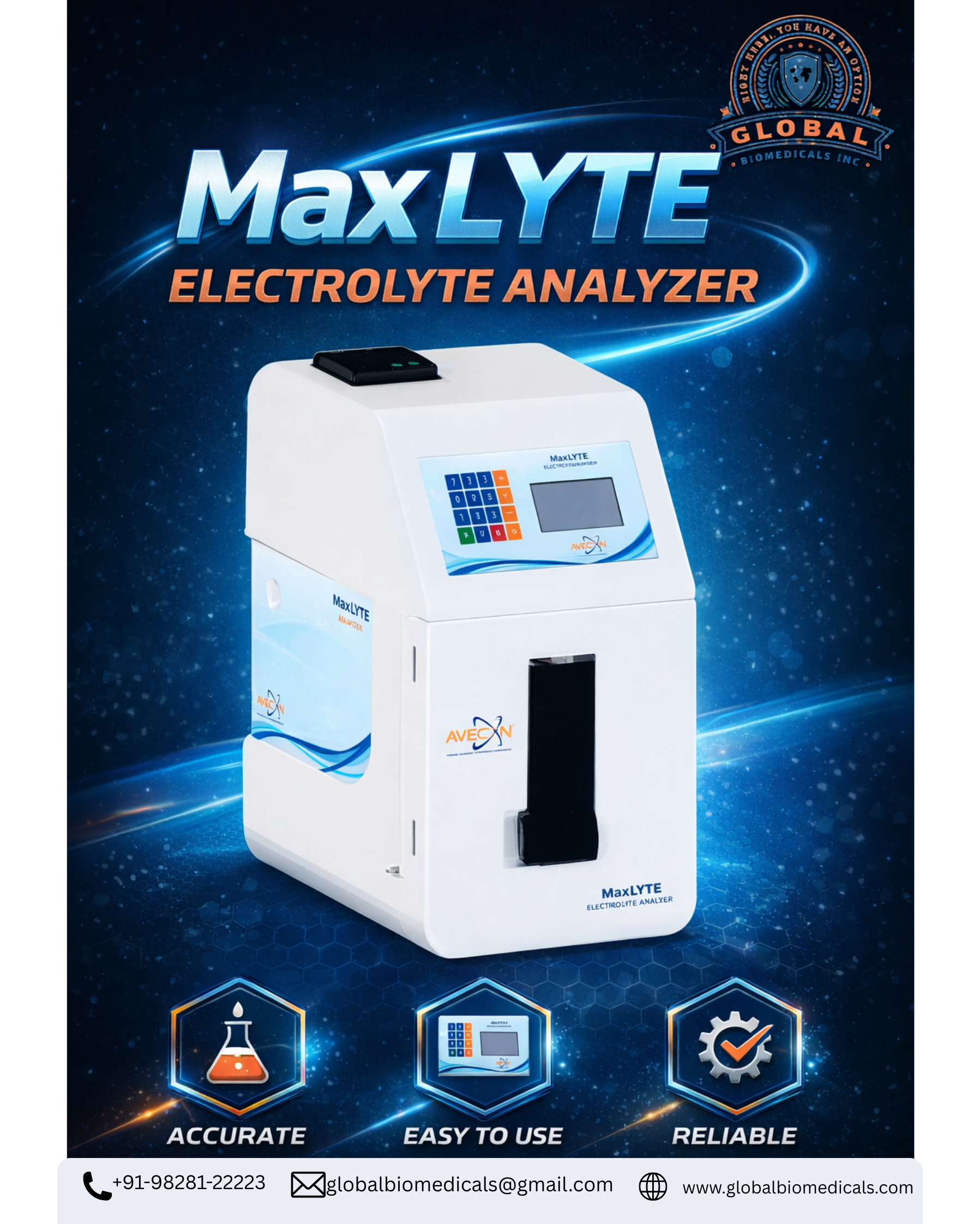 The MaxLYTE Electrolyte Analyzer is a fully automated, microprocessor-based clinical chemistry instrument designed for precise and rapid determination of electrolytes including Sodium (Na⁺), Potassium (K⁺), and Chloride (Cl⁻) using advanced Ion Selective Electrode (ISE) technology. It supports analysis of serum, plasma, whole blood, and urine samples with high accuracy and reproducibility. The system features automatic calibration, real-time quality control monitoring, low sample and reagent consumption, and fast processing speed for high-throughput laboratory operations. Equipped with an intuitive keypad interface and high-resolution LCD display, the analyzer ensures easy operation and minimal training requirements. Its compact bench-top design, stable performance, low maintenance requirements, and robust construction make it suitable for continuous use in hospitals, diagnostic laboratories, and clinical research environments. The MaxLYTE Electrolyte Analyzer delivers consistent, reliable results while optimizing workflow efficiency and operational costs.