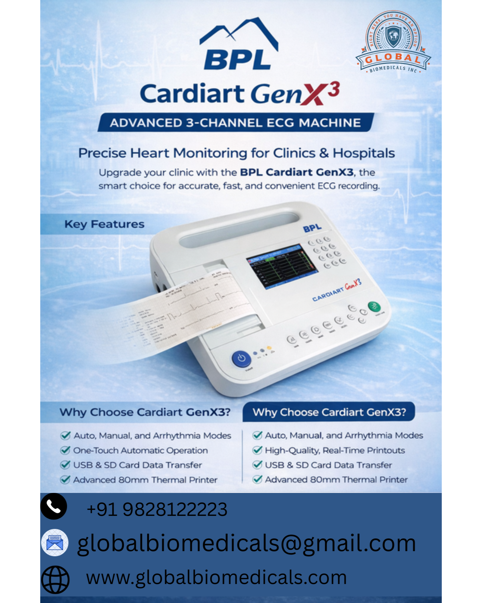 The BPL Cardiart GenX3 is an advanced 3-channel ECG machine designed for precise and reliable cardiac monitoring in clinics, hospitals, and diagnostic centers. It features standard 12-lead ECG acquisition with a high-resolution color LCD display for real-time waveform monitoring and offers recording modes including Auto, Manual, and Arrhythmia detection. Equipped with a built-in high-quality 80mm thermal printer, internal memory, and USB/SD card support, it ensures seamless data storage and transfer for efficient workflow management. Its compact, lightweight design with rechargeable battery backup makes it ideal for bedside use and emergency applications, delivering accurate performance and user-friendly one-touch operation for modern healthcare environments. Keywords: BPL ECG Machine, Cardiart GenX3, 3 Channel ECG, 12 Lead ECG Machine, Portable ECG Device, Cardiac Monitoring System, Diagnostic ECG Equipment, Hospital ECG Machine. Hashtags: #BPL #CardiartGenX3 #ECGMachine #Cardiology #HeartMonitoring #MedicalEquipment #HospitalEquipment #DiagnosticDevices #HealthcareTechnology #ClinicalDiagnostics #RajBiosis #ECGSystem