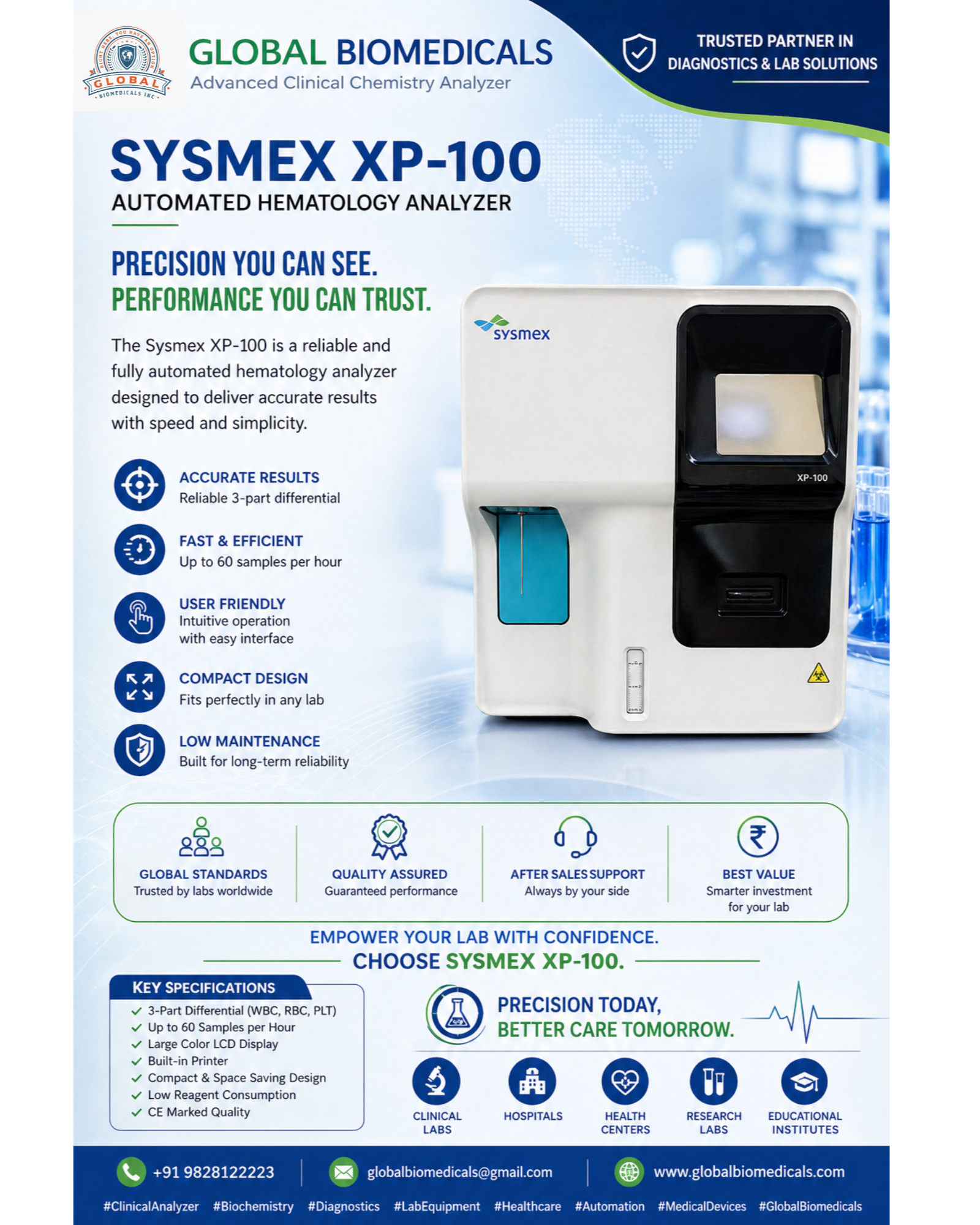 The Sysmex XP-100 Automated Hematology Analyzer is a compact and fully automated 3-part differential system designed for small to medium laboratories, clinics, and hospitals, delivering fast, accurate, and reliable CBC results with minimal operator intervention. It offers a throughput of up to 60 samples per hour and measures key parameters including WBC, RBC, hemoglobin, hematocrit, and platelet count with high precision. Featuring an easy-to-use interface, color LCD display, built-in printer, and efficient data management, it ensures smooth workflow and user convenience. Its low reagent consumption, space-saving design, and low maintenance requirements make it a cost-effective and dependable solution for routine hematology testing, providing consistent performance and high-quality diagnostic results.