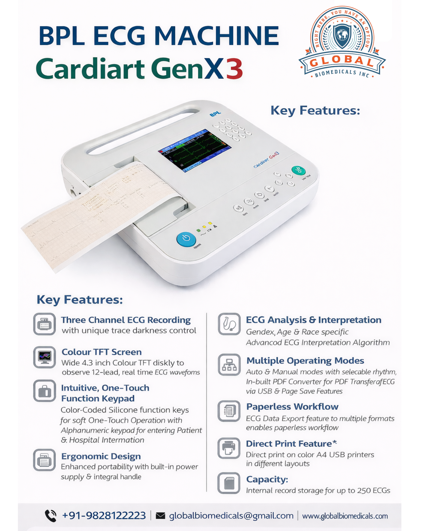 The Cardiart GenX3 also offers advanced ECG analysis and interpretation using the Glasgow ECG Interpretation Algorithm, which helps provide reliable diagnostic support. Its complete analysis display ensures a detailed view of ECG results directly on the TFT screen. The device supports multiple operating modes including auto and manual modes, with built-in PDF conversion for easy ECG data transfer through USB. The paperless workflow feature allows ECG data to be exported in multiple formats, improving digital record management. Additionally, the machine supports direct printing to color A4 USB printers in different layouts, providing flexible reporting options.