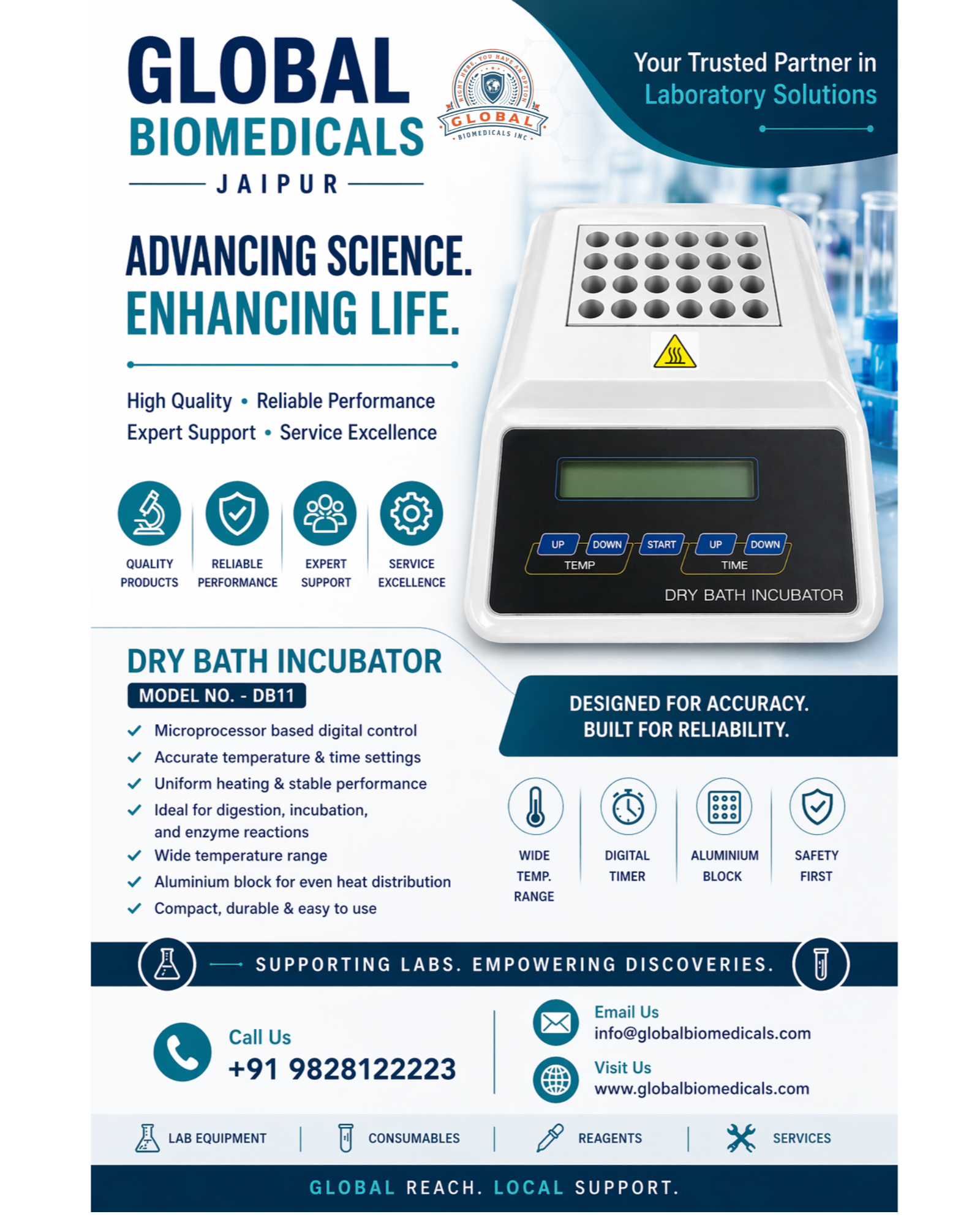 The Dry Bath Incubator (Model DB11) is a compact, high-performance laboratory device designed for precise temperature control and uniform heating, ideal for applications such as incubation, digestion, enzyme reactions, and sample preparation in clinical and research labs. Equipped with a microprocessor-based control system, it ensures accurate temperature regulation (Ambient +5°C to 100°C) with ±0.5°C accuracy and uniformity, along with a digital LCD display and programmable timer (1 min to 99 hrs 59 min) for ease of operation. Its high-quality aluminium heating block provides excellent heat distribution and supports multiple tube sizes, while the durable and user-friendly design makes it suitable for continuous lab use. #DryBathIncubator #LabEquipment #Biomedical #Diagnostics #LaboratoryInstruments #Incubator #ClinicalLab #ResearchLab #MedicalEquipment #TemperatureControl #Biotech #PathologyLab #LabSolutions #DigitalIncubator #HealthcareEquipment #GlobalBiomedicals #JaipurBusiness #LabTechnology #PrecisionInstruments #ScientificEquipment