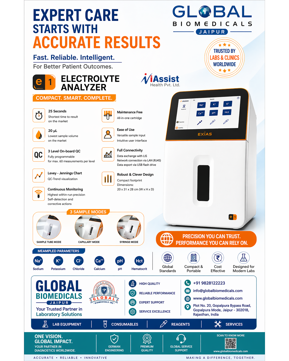 The Electrolyte Analyzer (E1 – iAssist Health Pvt. Ltd.) is a compact, fully automated diagnostic system designed for fast, accurate, and reliable measurement of key parameters such as Sodium (Na⁺), Potassium (K⁺), Chloride (Cl⁻), Calcium (Ca²⁺), pH, and Hematocrit (Hct), delivering results in just 25 seconds with a minimal sample volume of 20 µL, making it ideal for laboratories, ICUs, and emergency settings; it features a maintenance-free all-in-one cartridge system, 3-level onboard QC with programmable settings, continuous sensor monitoring for high precision, Levy-Jennings chart for QC analysis, intuitive user interface, multiple sample modes (sample tube, capillary, syringe), and advanced connectivity including LIS integration, LAN (RJ45), and USB data export, all within a compact footprint (20 × 31 × 28 cm), ensuring cost-effective operation, high efficiency, and reliable performance for modern diagnostic labs #ElectrolyteAnalyzer #LabEquipment #Diagnostics #ClinicalChemistry #IVD #NaKCl #CalciumTesting #BloodGas #PointOfCare #MedicalDevices #Healthcare #LabSolutions #DiagnosticLab #Pathology #ICUEquipment #HospitalSupplies #GlobalBiomedical #Jaipur #LabAutomation #AccurateResults #FastTesting #MedicalTechnology