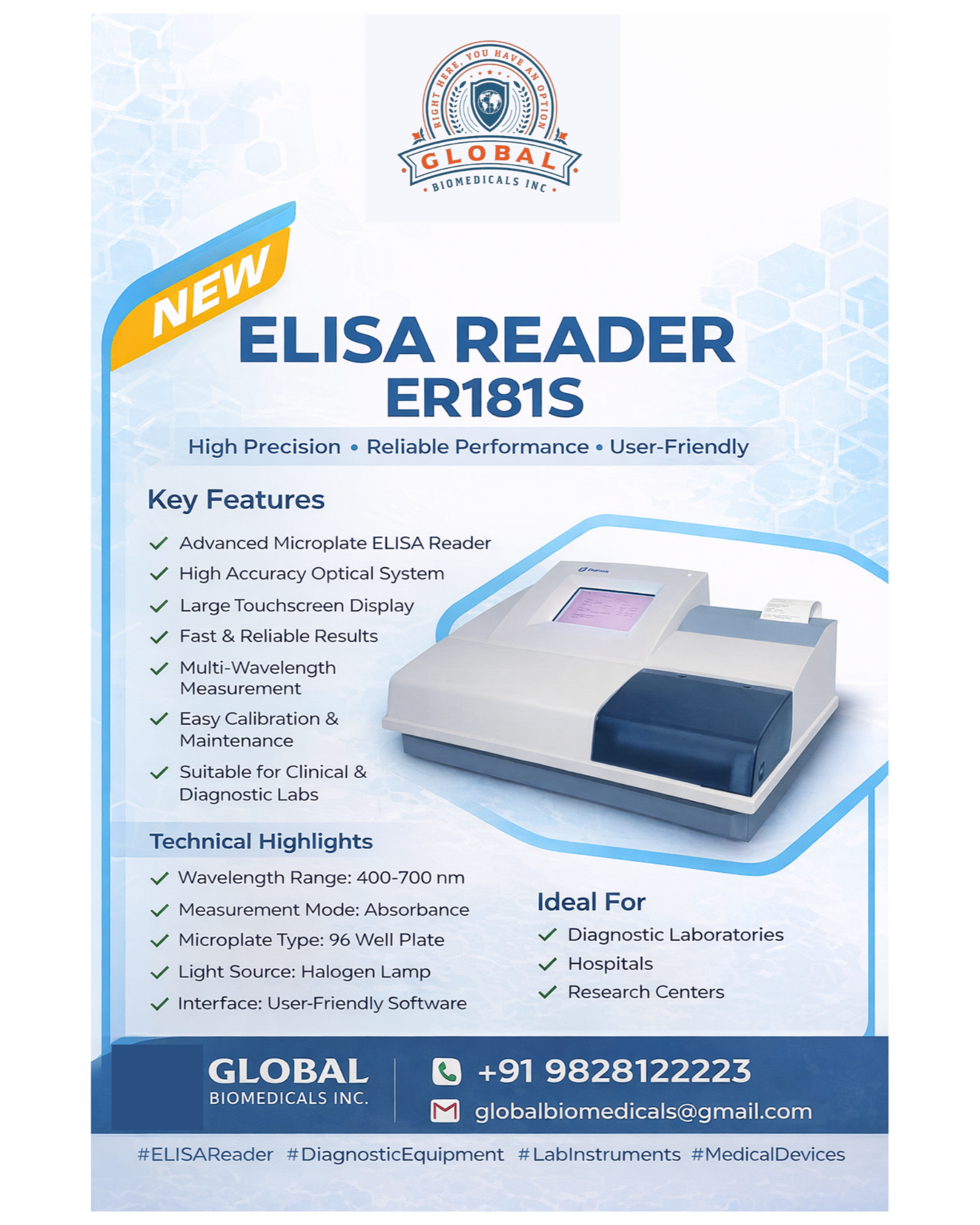 The ELISA Reader ER181S is a high-performance microplate reader designed for precise and reliable ELISA testing in clinical, diagnostic, and research laboratories, featuring an advanced optical system with multi-wavelength capability (400–700 nm) for accurate absorbance measurement across a wide range of assays including hormones, infectious diseases, and tumor markers; it supports standard 96-well plates and uses a stable halogen lamp to ensure consistent results, while its user-friendly touchscreen interface enables easy operation, fast data processing, simple calibration, and low maintenance, making it an ideal solution for hospitals and labs seeking efficient, compact, and dependable diagnostic performance, #ELISAReader #ER181S #DiagnosticEquipment #LabInstruments #ELISATesting #ClinicalDiagnostics #MedicalDevices #MicroplateReader #LaboratoryEquipment #HealthcareTechnology #IVD #DiagnosticLab #HospitalEquipment #Biotechnology #LabSolutions #GlobalBiomedicals