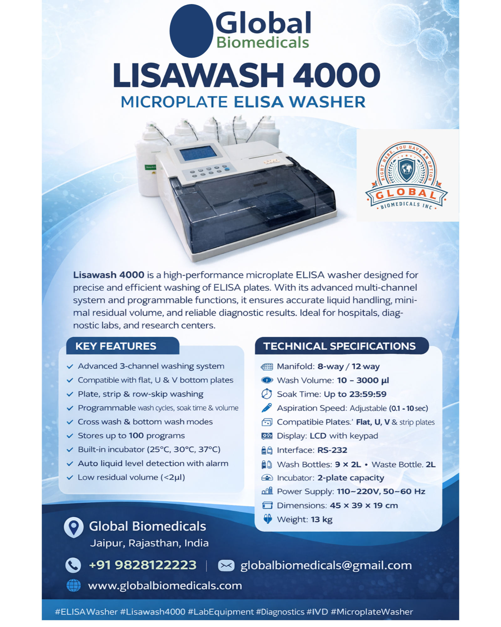 Lisawash 4000 Microplate ELISA Washer is a high-performance and reliable laboratory instrument designed for precise and efficient washing of ELISA plates, featuring an advanced 3-channel washing system with 8/12-way manifold, compatible with flat, U & V bottom and strip plates, offering programmable wash cycles with wash volume range of 10–3000 µl, adjustable aspiration speed (0.1–10 sec), and extremely low residual volume (<2 µl) to ensure accurate and reproducible results; it supports multiple washing modes including plate, strip, row-skip, cross wash and bottom wash, with storage capacity of up to 100 programs, and comes with a built-in 2-plate incubator (25°C, 30°C, 37°C), LCD display with keypad, RS-232 interface, 3×2L wash bottles, 2L waste bottle, operating on 110–220V power supply, making it an ideal solution for diagnostic laboratories, hospitals and research centers requiring efficient ELISA processing; #ELISAWasher #Lisawash4000 #MicroplateWasher #LabEquipment #Diagnostics #IVD #LabAutomation #Healthcare #Biotechnology #GlobalBiomedicals