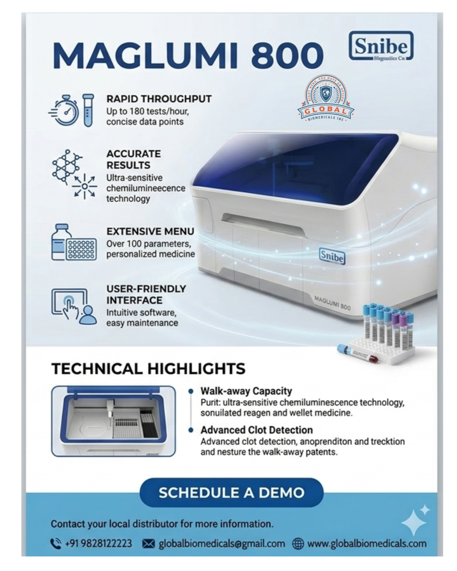 The MAGLUMI 800 is a state-of-the-art, fully automated Chemiluminescence Immunoassay (CLIA) analyzer by Snibe Diagnostics, designed to bring high-performance testing to small and medium-sized laboratories through its compact, space-saving design. This powerful system delivers a rapid throughput of up to 180 tests per hour with a fast time-to-first-result of just 17 minutes, utilizing advanced Flash Chemiluminescence (ABEI label) technology for ultra-sensitive and accurate diagnostics across a broad menu of over 180 parameters, including thyroid, fertility, and tumor markers. Key technical specifications include 40 sample positions, 9 refrigerated reagent positions, intelligent clot detection, and a steady incubation temperature of $37^circ C$, all managed through an intuitive, user-friendly interface with bi-directional LIS/HIS connectivity. Ideal for clinical efficiency, it supports non-stop loading and minimal maintenance, making it a cornerstone for modern medical labs. #cliaanalyzer #immunoassay #hormoneanalyzer #snibe #maglumi800 #medicaldiagnostics #labautomation #ivd #clinicallaboratory #medtech #healthcareinnovation #labtech #biomedicalscience #diagnosticlab #thyroidtesting #fertilitytesting