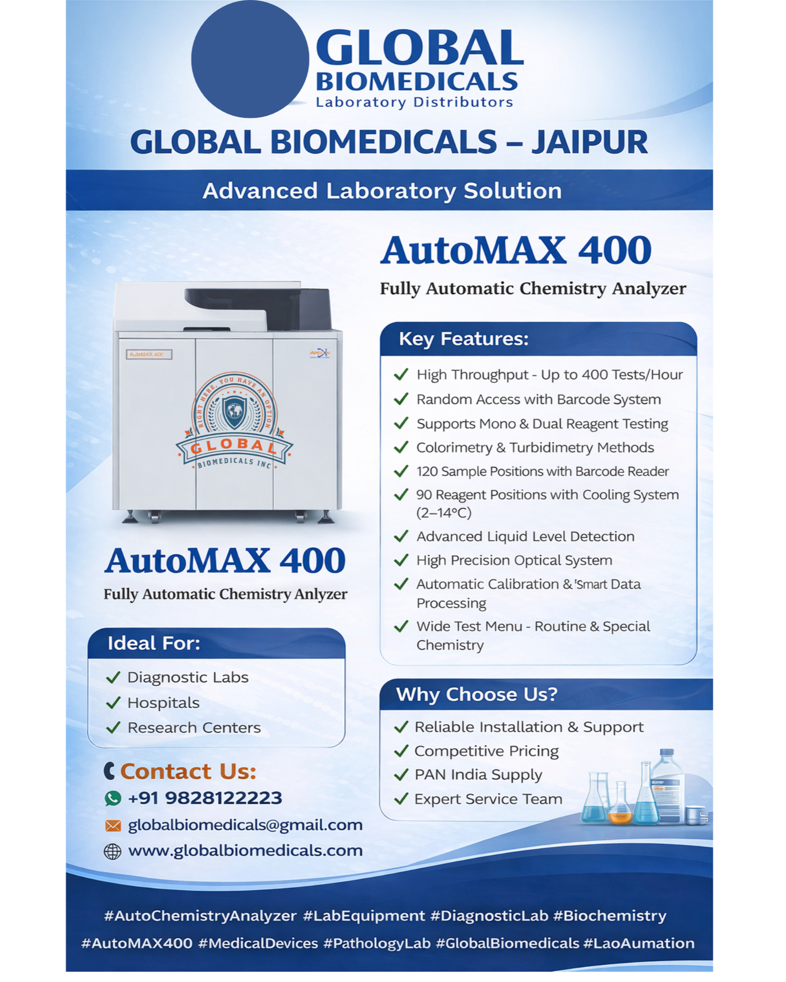 he AutoMAX 400 Fully Automatic Chemistry Analyzer is a high-performance clinical biochemistry system designed for fast, accurate, and reliable diagnostic testing, offering a throughput of up to 400 tests per hour using advanced colorimetric and turbidimetric methods. It features 120 sample positions with barcode support, 90 reagent positions with an integrated cooling system (2°C–14°C), and 90 reaction cuvettes for efficient processing. Equipped with a halogen lamp (340–700 nm), wide absorbance range (0–4.0 Abs), and precise Peltier incubation at 37°C ± 0.1°C, it ensures high analytical accuracy. The system supports multiple test modes including end-point, kinetic, fixed-time, and 2-point, along with linear and non-linear automatic calibration, paddle-type mixing to reduce carryover, and advanced liquid level detection with collision protection. With intelligent data processing, LIS connectivity, and minimal manual intervention, the AutoMAX 400 is ideal for diagnostic labs, hospitals, and research centers seeking reliable and high-throughput lab automation solutions. #AutoMAX400 #AutoChemistryAnalyzer #BiochemistryAnalyzer #LabEquipment #DiagnosticLab #PathologyLab #MedicalDevices #LabAutomation #ClinicalChemistry #IVD #HealthcareSolutions #GlobalBiomedicals #JaipurBusiness