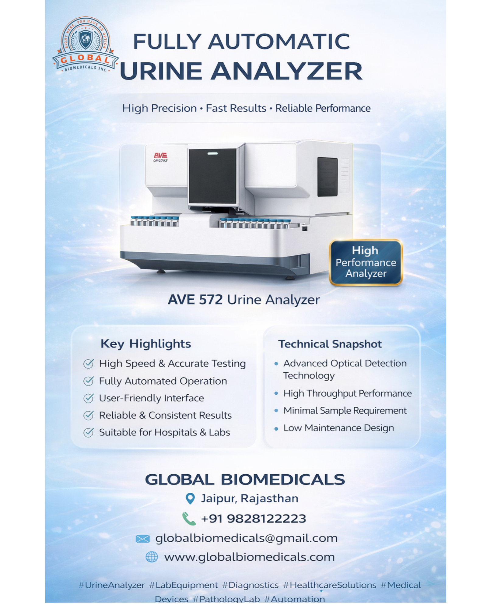 The AVE 572 Fully Automatic Urine Analyzer is a high-performance diagnostic solution designed for rapid and accurate urine analysis in clinical laboratories and hospitals. Equipped with advanced optical detection technology, it ensures precise measurement with minimal human intervention, enhancing workflow efficiency and reducing errors. The analyzer offers high throughput performance, user-friendly interface, and reliable results, making it ideal for routine and high-volume testing environments. It supports multiple parameters testing with quick turnaround time, low sample requirement, and minimal maintenance. Technical specifications include fully automated operation, optical reflectance photometry technology, high sample processing capacity, onboard data management system, LCD display interface, and compatibility with LIS connectivity for seamless data integration. #UrineAnalyzer #LabEquipment #Diagnostics #HealthcareSolutions #MedicalDevic