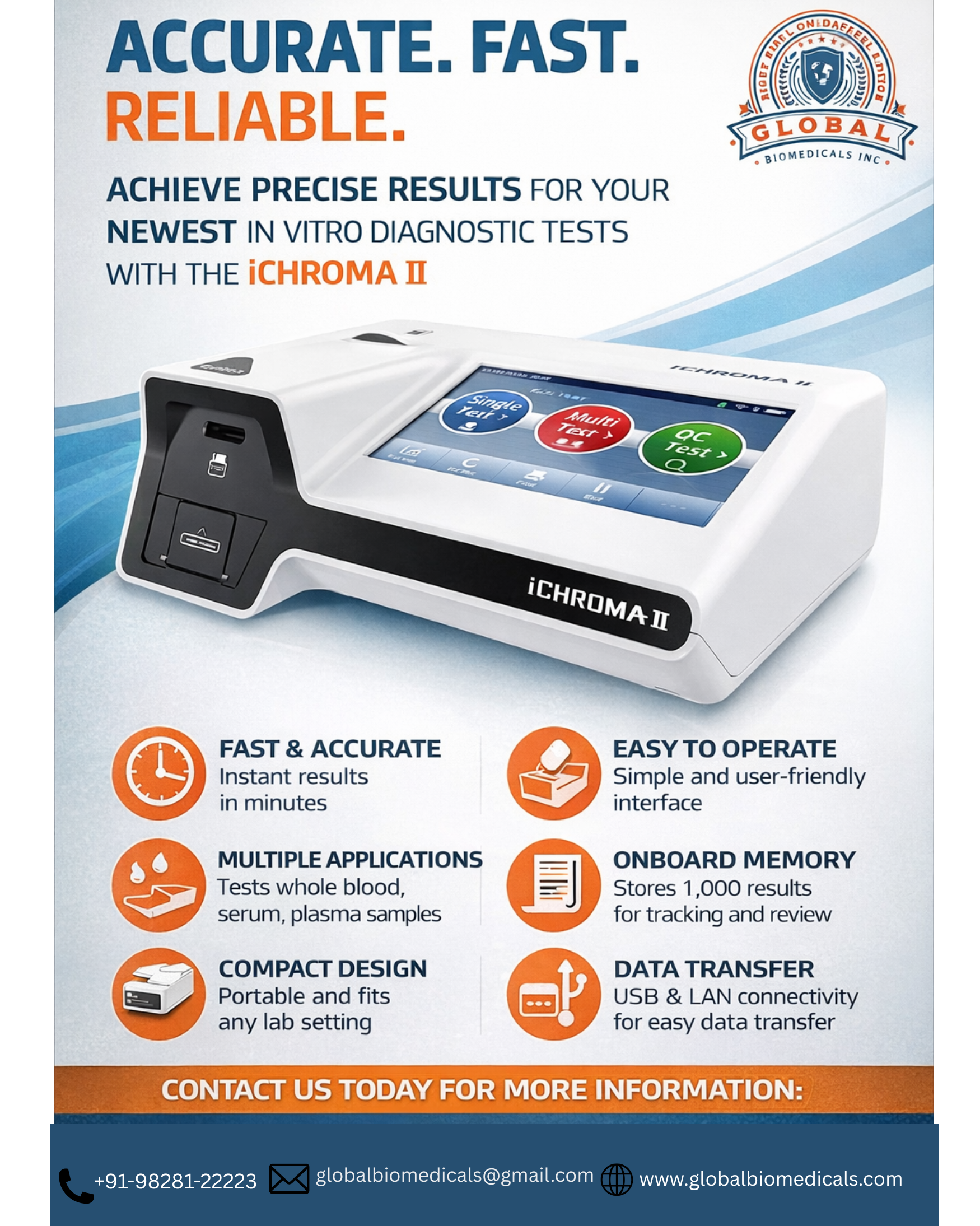 The iCHROMA™ II is a fluorescence immunoassay (FIA)–based point-of-care analyzer designed for rapid and accurate in-vitro diagnostic testing. It supports single, multi, and quality control test modes and is compatible with whole blood, serum, and plasma samples, requiring a low sample volume of approximately 10–30 µL depending on the assay. The analyzer delivers quantitative results within 3–15 minutes and features a large color LCD touchscreen for easy operation. It offers internal memory storage for up to 1, 000 test results and includes a built-in thermal printer for immediate report generation. Data connectivity is supported via USB and LAN interfaces. The system operates on AC power (100–240V, 50/60Hz) and is designed for stable performance within an operating temperature range of 15°C to 30°C. Its compact, lightweight tabletop design makes it suitable for laboratories, clinics, and point-of-care testing environments.
