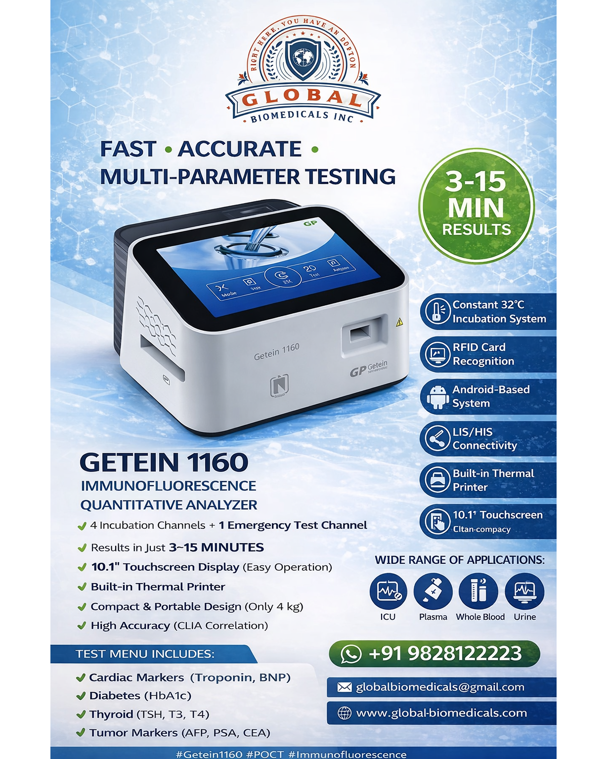 The Getein 1160 Immunofluorescence Quantitative Analyzer is a compact, high-performance point-of-care testing (POCT) system designed for rapid and accurate multi-parameter diagnostics, featuring advanced immunofluorescence technology with 4 incubation channels and 1 emergency test channel to enable simultaneous testing and faster turnaround, delivering results within 3–15 minutes; it operates on a stable 32°C constant incubation system to ensure high precision with strong correlation to CLIA methods, and supports a wide range of sample types including serum, plasma, whole blood, capillary blood, urine, swab, saliva, and stool with sample volumes ranging from 10–200 µL; the analyzer is equipped with a 10.1-inch touchscreen display, Android-based interface for easy operation, built-in thermal printer, RFID card recognition, auto cartridge collection, and SD card calibration, while offering excellent repeatability (CV ≤2% and ≤10% depending on range) and large storage capacity of over 100, 000 results; it also provides seamless connectivity through LIS/HIS integration, USB ports, Ethernet, and COM port, making it ideal for ICU, emergency, laboratories, clinics, and ambulances, and its portable design (approx. 4 kg, dimensions 299×276×152 mm) combined with its broad test menu covering cardiac markers, diabetes, thyroid, infection, tumor markers, fertility, renal function, and infectious diseases makes it a complete diagnostic solution; keywords include POCT analyzer, immunofluorescence system, rapid diagnostic device, multi-parameter analyzer, and lab equipment, with hashtags such as #Getein1160 #POCT #Immunofluorescence #Diagnostics #MedicalDevices #LabEquipment #RapidTesting #Healthcare #ICU #DiagnosticSolutions.