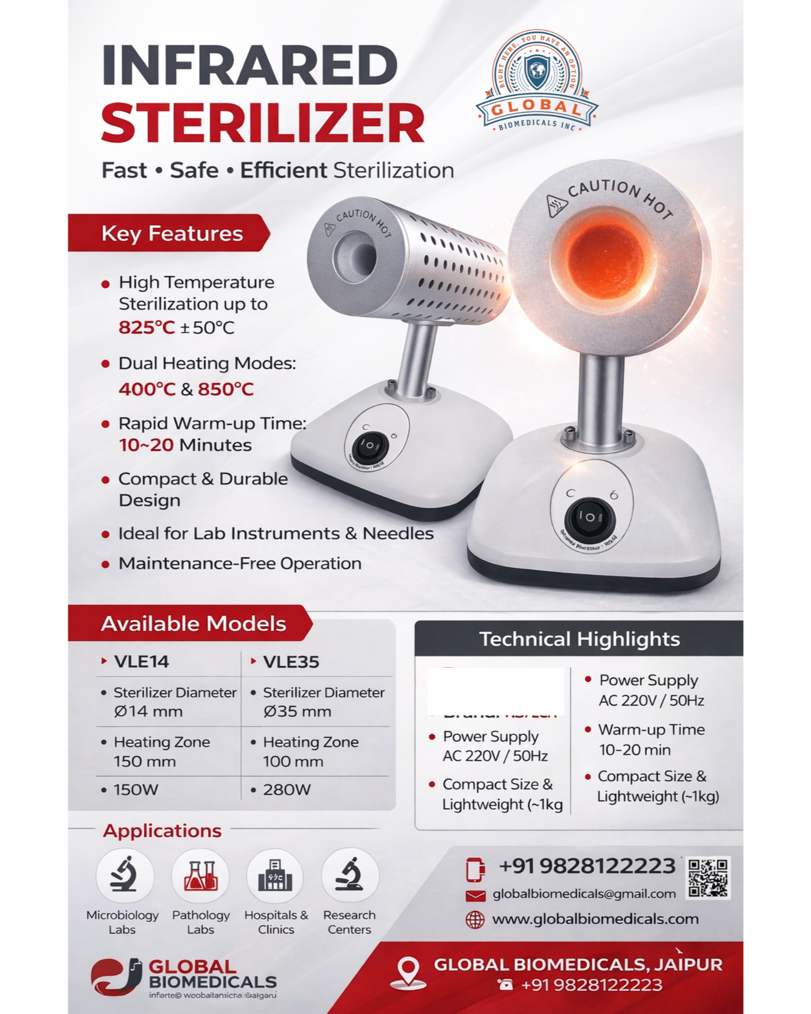 The Infrared Sterilizer is a high-performance, flame-free sterilization device designed for laboratories, hospitals, and research facilities, using advanced infrared heating technology to rapidly and effectively sterilize inoculating loops, needles, and small instruments at temperatures up to 825°C ±50°C, ensuring complete microbial elimination with enhanced safety and efficiency; it features dual heating modes (400°C & 850°C), a quick warm-up time of 10–20 minutes, and a compact, durable, and maintenance-free design suitable for continuous use, with models offering sterilization diameters of Ø14 mm and Ø35 mm, heating zone lengths of 150 mm and 100 mm, and power ratings of 150W and 280W, operating on AC 220V / 50Hz supply, making it ideal for microbiology labs, pathology labs, hospitals, research centers, and pharmaceutical applications; keywords include Infrared Sterilizer, Loop Sterilizer, Needle Sterilizer, Flame-Free Sterilizer, Laboratory Sterilizer, High Temperature Sterilizer, Microbiology Equipment and hashtags include #InfraredSterilizer #LabEquipment #MicrobiologyLab #Sterilization #MedicalEquipment #PathologyLab #ResearchLab #HospitalEquipment #LabInstruments #DiagnosticLab #Biomedical #FlameFreeSterilizer #NeedleSterilizer.