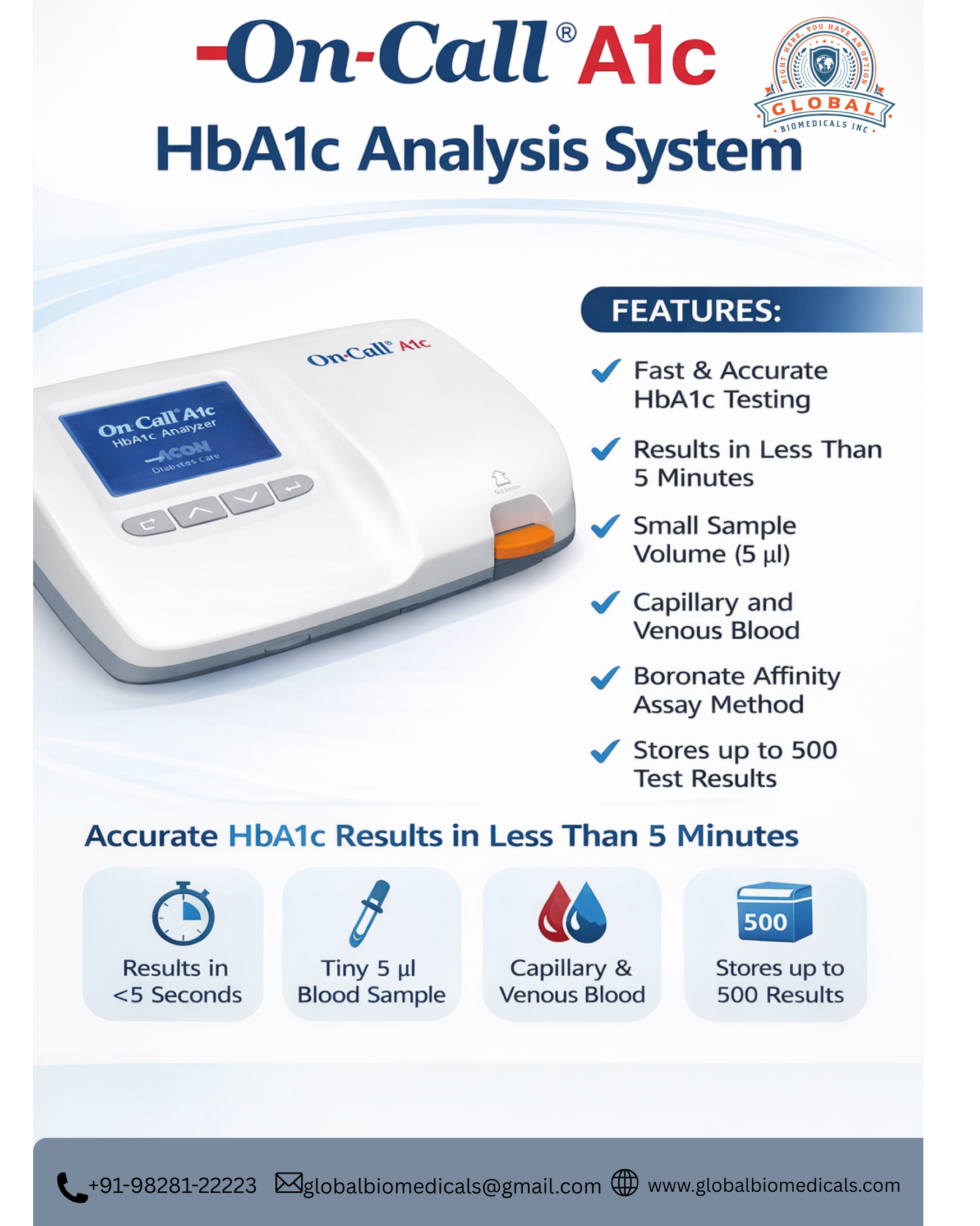 The On-Call A1c HbA1c Analysis System is a compact and reliable diagnostic analyzer designed for the rapid measurement of glycated hemoglobin (HbA1c), which is essential for monitoring long-term blood glucose control in patients with diabetes. Using the Boronate Affinity Assay methodology, the system provides accurate and consistent HbA1c results in less than 5 minutes, making it ideal for clinics, laboratories, and point-of-care testing environments. The analyzer requires only a 5 µL blood sample and supports both capillary (finger-prick) and venous whole blood, allowing convenient and flexible testing. It has a measurement range of 4%–15% HbA1c and reports results in NGSP (%) and IFCC (mmol/mol) units. The device operates with an AC adapter (100–240 V AC, 50/60 Hz) and includes a built-in memory capable of storing up to 500 test results. It also features automatic sleep mode after 30 minutes, and supports optional external printer and barcode reader connectivity. The analyzer has a compact design with dimensions of 188 mm × 153 mm × 52 mm and weighs approximately 590 g with the AC adapter, making it portable and easy to use in healthcare settings. The device functions effectively within operating conditions of 15–30°C and 15–80% relative humidity, while the analyzer storage conditions are 0–50°C with 10–90% RH, and test cartridges should be stored at 2–8°C for optimal performance. Overall, the On-Call A1c system provides a fast, accurate, and efficient solution for HbA1c testing in modern diabetes management.