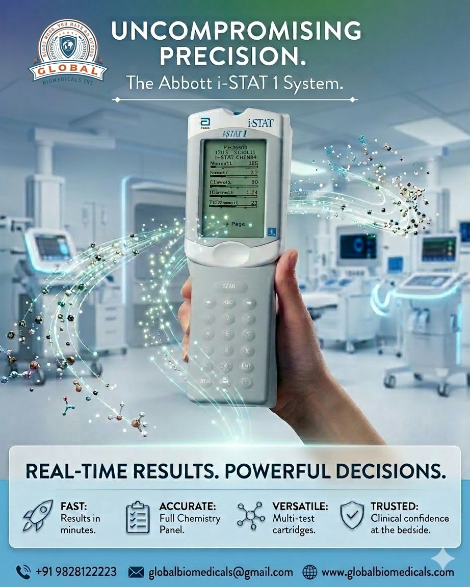 The Abbott i‑STAT 1 System by Abbott Laboratories is a compact, portable point-of-care diagnostic analyzer designed to deliver rapid and accurate laboratory-quality results directly at the patient’s bedside. This handheld system uses advanced disposable microfluidic cartridges with biosensor technology to analyze a small whole blood sample (arterial, venous, or capillary) and measure multiple critical parameters including blood gases (pH, pCO₂, pO₂), electrolytes (Na⁺, K⁺, Cl⁻, ionized Ca²⁺), and chemistry markers such as glucose, creatinine, lactate, and BUN. With a sample volume of approximately 65–95 µL and result time of about 2–10 minutes, the device provides fast clinical data for emergency departments, ICUs, operation theaters, ambulances, and remote healthcare settings. The system features an easy-to-use interface, LCD display, rechargeable battery operation, and wireless connectivity for seamless integration with LIS/HIS hospital systems, making it an ideal solution for rapid bedside diagnostics and critical care decision-making. Keywords: Point-of-Care Analyzer, Portable Blood Analyzer, Blood Gas Analyzer, Electrolyte Analyzer, Rapid Diagnostic Device, Handheld Laboratory Analyzer, Critical Care Testing. Hashtags: #PointOfCareTesting #iSTAT #BloodGasAnalyzer #ElectrolyteAnalyzer #POCT #RapidDiagnostics #CriticalCare #HospitalEquipment #MedicalTechnology #HealthcareInnovation.