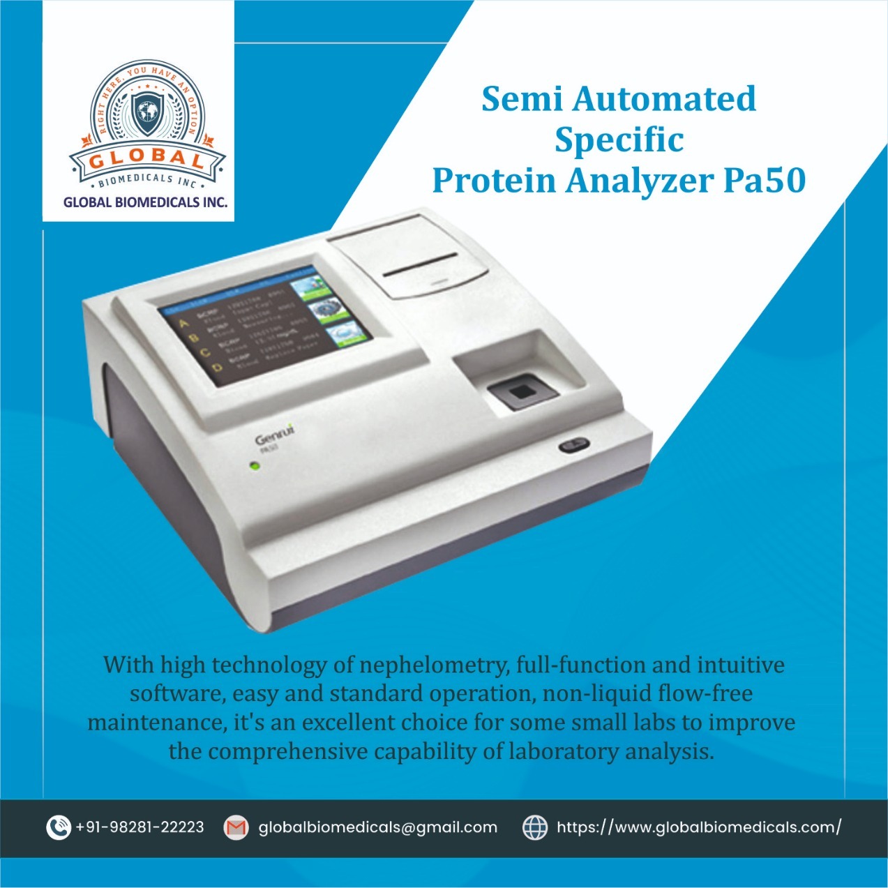 The Genrui PA50 is a compact, semi-automated specific protein analyzer designed to bring high-end fixed-time nephelometry technology to small-and-medium-sized laboratories. This benchtop powerhouse delivers rapid, accurate results for a wide range of critical markers—including HbA1c, HS-CRP, CRP, ASO, RF, mALB, D-Dimer, CYS-C, IgG, IgA, IgM, C3, and C4—with a throughput of up to 40 samples per hour. Engineered for maximum efficiency, the system features a 5.6-inch color touch screen, hassle-free magnetic card calibration, and full LIS connectivity, all while maintaining a non-liquid flow design that ensures zero liquid maintenance and exceptional reliability. Whether used as a primary dedicated protein analyzer or a dependable backup, the Genrui PA50 is the ultimate solution for modern diagnostics. #ProteinAnalyzer #Nephelometry #GenruiPA50 #InVitroDiagnostics #MedicalEquipment #HbA1c #LaboratoryAnalysis #POCT #BiomedicalEngineering