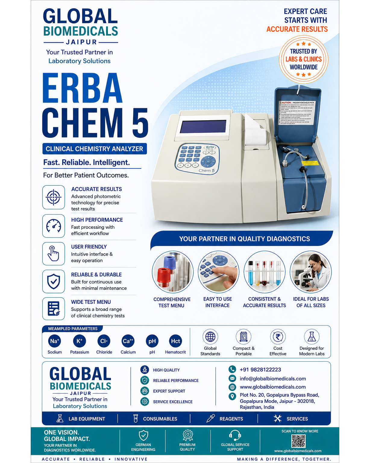 The ERBA CHEM 5 is a compact and reliable semi-automatic clinical chemistry analyzer designed for small to medium laboratories, delivering fast, accurate, and cost-effective diagnostic results using advanced photometric technology; it supports a wide range of biochemistry parameters such as glucose, urea, creatinine, cholesterol, enzymes, and more, ensuring precise and reproducible outcomes with an easy-to-use interface, low reagent consumption, and minimal maintenance, making it ideal for routine lab workflows; technical specifications include semi-automatic operation, photometric measurement system, wavelength range approximately 340–630 nm (filter-based), open reagent system, low sample volume requirement, multiple modes like kinetic, endpoint and fixed time, built-in quality control, compact design, and printer compatibility; #ErbaChem5 #ClinicalChemistryAnalyzer #LabEquipment #Diagnostics #BiochemistryAnalyzer #GlobalBiomedicals #Jaipur #MedicalDevices #LaboratorySolutions #AccurateResults #HealthcareTechnology #PathologyLab #IVD #DiagnosticSolutions